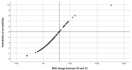 Probability of reversibility of ECG alterations as a function of BMI change between admission (T0) and discharge (T2).