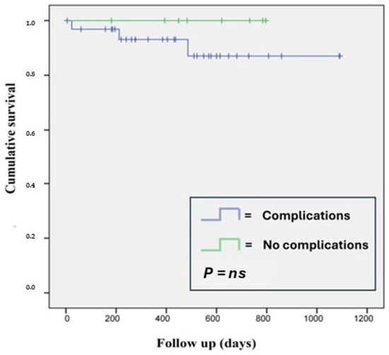 Kaplan–Meier analysis of patient survival at follow-up based on peri-procedural complications.