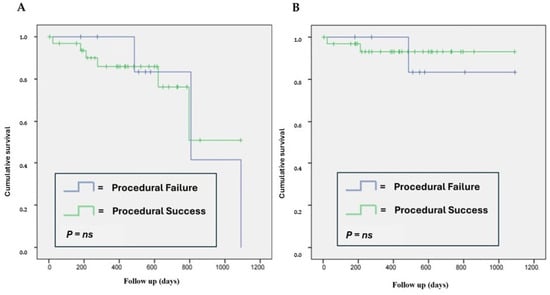 The rate of rehospitalizations for cardiovascular issues was 17.1% (seven patients). Only one patient required repeat PCI of the target vessel, and no cases of stroke or acute myocardial infarction were observed during follow-up. The overall frequency of MACEs was 22.0% (9 patients), and Kaplan–Meier analysis showed that achieving procedural success did not influence the survival rate or MACEs at follow-up (Figure 2).