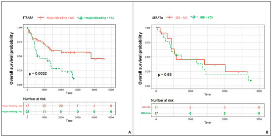 Time-to-event Kaplan–Meier curves: patients’ survival probabilities according to the major bleeding status (A) and according to the bleeding type (GIB vs. other major bleeding) (B).
