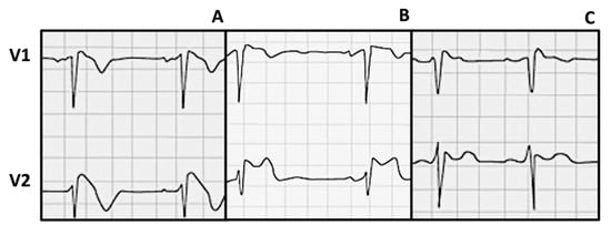 Brugada ECG patterns (A: type 1; B: type 2; C: type 3).