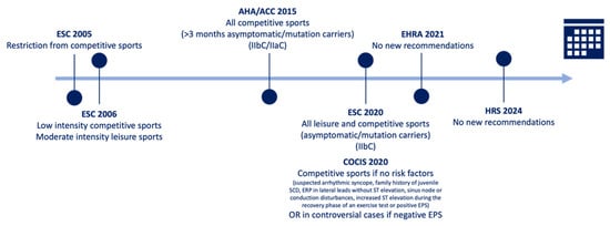 According to the 2006 ESC recommendations, only low-intensity competitive sports and moderate-intensity leisure sports were allowed in spontaneous or induced BrS patients (with symptoms or inducible), while in genotype-positive/phenotype-negative patients, low-to-moderate intensity competitive sports were permitted. There was a relative contraindication for sports with intrinsic risk due to potential complications from syncope episodes, such as trauma [18]. In contrast, the 2015 American recommendations suggested that competitive sports may be considered in asymptomatic (more than 3 months) BrS athletes (recommendation IIb C), while all intensities were allowed for genotype-positive/phenotype-negative patients (recommendation IIa C), with general preventive recommendations [24].