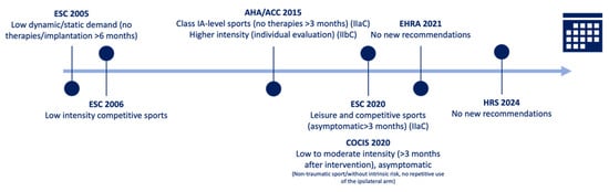 Recommendations for the eligibility of individuals with an implantable cardioverter defibrillator (ICD) to participate in sports have also changed over time (Figure 4 and Table 3). In line with the 2005 ESC recommendations and the 2006 European document, ICD implantation was a reason for disqualification from competitive sports, except in cases of low-intensity sports (e.g., golf, bowling) and in low-to-moderate intensity leisure sports [18,23,24]. In these cases, sports participation was only allowed six months after implantation or in the absence of symptoms [23].