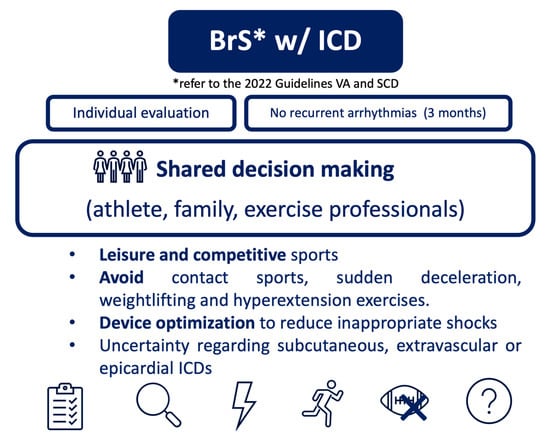 On the other hand, competitive sports should be permitted in asymptomatic BrS patients (for more than 3 months) with an ICD according to the 2020 ESC guidelines, avoiding contact sports. Conversely, the Italian recommendations are more restrictive regarding the intensity of sports that ICD patients should be involved in, but no recommendations are specific to BrS patients.