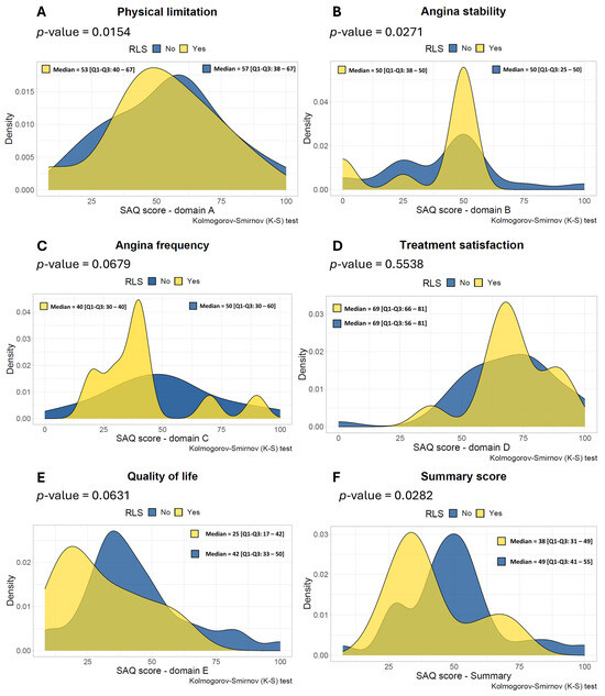 Density plots of the Seattle Angina Questionnaire scores across different subdomains. This figure consists of the subdomains (A–E) and summary score of all included patients (n = 48), whereas the yellow color represents patients with RLS due to a Patent Foramen Ovale (n = 11) and the blue color represents patients without RLS (n = 37). (A)—physical limitation, (B)—angina stability, (C)—angina frequency, (D)—treatment satisfaction and (E)—quality of life and the SAQ summary score (F). RLS = right-to-left shunting. SAQ = Seattle Angina Questionnaire.