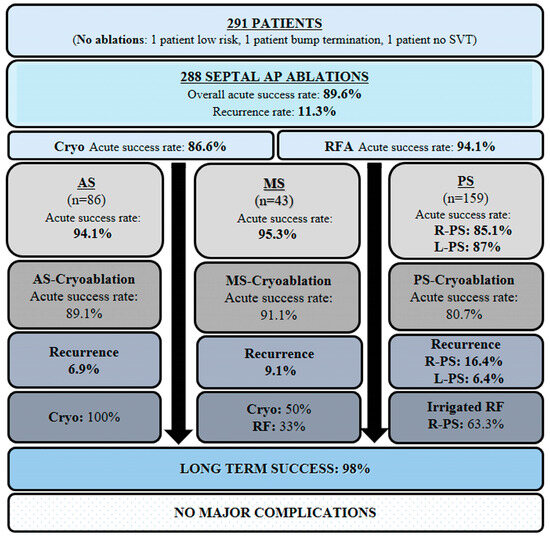Despite technological improvements, extensive RFA experience, and cautious RF applications, the iatrogenic incidence of undesired AV block during septal ablations is still non-negligible. No case of persistent AV block was reported using cryoablation, whereas RFA accounts for between 2 and 10% [4,17,29]. Knowledge of these risks may influence both the patients’ and the electrophysiologists’ decisions. Ergul et al. reported that RFA was not performed in 29% of their patients who underwent previous EPSs at other centers due to the high risk of AV block [16]. Thus, despite the concerns regarding a greater recurrence rate, cryoenergy has been recommended for AS and MS locations due to AV block risk reported for RFA [4,5,6,7,8,29]. In our study, only cryoablation was preferred in 94.1% of AS and 76% of MS APs. There were no instances of permanent damage to normal conduction in our series. In addition to monitoring AV node conduction closely during mapping and ablation, we emphasize confirmation of underlying intact AV node conduction with differential atrial pacing maneuvers before and during the ablation. Using long sheaths, a superior approach via the jugular vein in selected patients, and apnea during energy delivery may also increase catheter stability and help limit the risk of AV node injury.