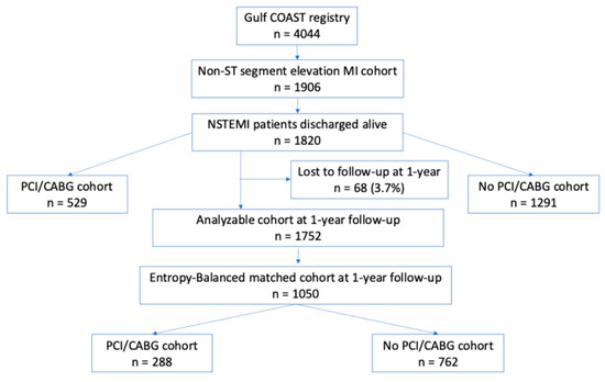 Schematic flow chart of the original Gulf COAST NSTEMI ACS cohort. NSTEMI, non-ST-elevation myocardial infarction; ACS, acute coronary syndrome; MI, myocardial infarction; PCI, percutaneous coronary intervention; CABG, coronary artery bypass graft.