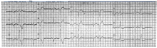 A 46-year-old hypertensive male with a family history suggestive of cardiomyopathy (the mother died at 41 while awaiting a heart transplant) first presented in 2017 with frequent asymptomatic premature ventricular contractions (PVCs). A 24 h ECG Holter monitoring recorded 21,865 PVCs (25.3% burden), predominantly monomorphic with left bundle branch block morphology and an inferior axis (Figure 1).