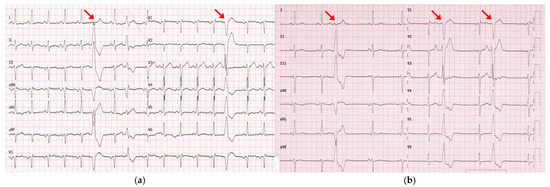 Figure 2. (a) ECG recorded in April 2023 during hospitalization for acute-onset HF showed sinus tachycardia and PVCs, mostly exhibiting the previously documented morphology (left bundle branch block with an inferior axis; red arrows). (b) ECG recorded in July 2023 documented the persistence of PVCs with the same morphology despite three months of optimal medical therapy.