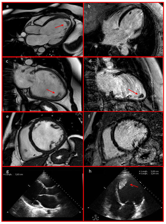 Figure 3. Cardiac MRI 3-chamber (a), 2-chamber (c), and short-axis (e) views revealed left ventricular dilation with severe biventricular dysfunction. These findings were also observed on the echocardiography in parasternal long-axis (g) and 4-chamber (h) views. An apical thrombus with a mobile component measuring 39.9 × 18.4 mm was identified (a,c,d,h; red arrows). Cardiac MRI late gadolinium enhancement (LGE) long-axis 4-chamber (b), 2-chamber (d), and short-axis (f) views excluded the presence of LGE.