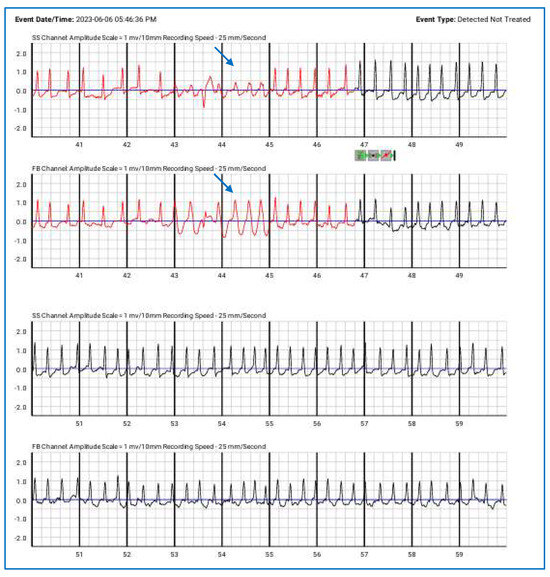 Figure 5. Episodes of paroxysmal atrial fibrillation correctly detected by the wearable cardioverter-defibrillator (detected but not treated), along with NSVT (blue arrows). The top lines represent the side-to-side (SS) channels, while the lower lines correspond to the front-to-back (FB) channels.