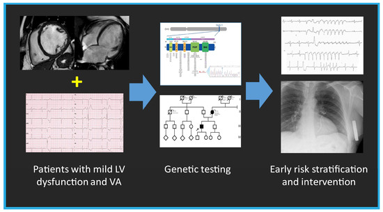 Figure 8. The summary figure (graphical abstract) emphasizes the importance of genetic testing in patients with mild left ventricular (LV) dysfunction and ventricular arrhythmia (VA), enabling early intervention and risk stratification.