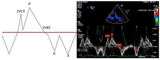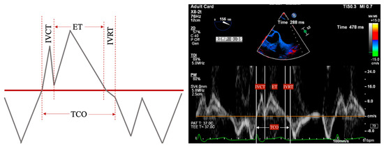 Figure 6. RIMP measurement performed in the DTG RV Inflow/Outflow view. Isovolumetric contraction time (IVCT), isovolumetric relaxation time (IVRT), ejection time (ET), and total contraction time (TCO).