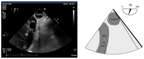 Given the anterior location of the PV and obscure insonation angles, its assessment can prove challenging by TEE. It is our practice to measure the PV and main pulmonary artery and assess gradients in multiple views including the Upper-Esophageal Aortic Arch Short Axis (UE-Ao Arch SAX), Mid-Esophageal RV Inflow/Outflow (ME-RV Inflow/Outflow), as well as the Mid-Esophageal ascending aorta short and long axis views (ME-Asc Ao SAX and LAX). In general, the ME-RV Inflow/Outflow view displays the PV on the long axis and is useful for detecting pulmonic regurgitation by CFD. The main PA (mPA) and the PV can be seen in the UE-Ao Arch SAX view on the left side of the display by turning the probe until these structures come into view [77]. Retroflexing the probe will often improve the view of the PV. The UE-Ao Arch SAX view usually allows the Doppler beam to be aligned parallel to flow through the PV and main PA and is therefore useful for measuring blood flow velocities through these structures [77]. However, this view can be difficult to obtain in most patients, due to displacement of the TEE probe by a dilated ascending aorta, or the lungs themselves. Therefore, modifications of the Deep Transgastric (DTG) views of the RV and Inflow/Outflow tract can prove useful.