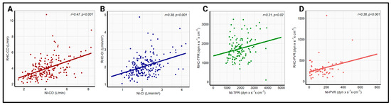 Linear correlation analysis between RHC-CO and NI-CO (A), RHC-CI and NI-CI (B), RHC-TPR and NI-TPR (C), and RHC-PVR and NI-PVR (D) in the overall cohort. NI-CI—non-invasively measured cardiac index, NI-CO—non-invasively measured cardiac output, NI-PVR—non-invasively measured pulmonary vascular resistance, NI-TPR—non-invasively measured total peripheral resistance, RHC-CI—right heart catheter-derived cardiac output, RHC-CO—right heart catheter-derived cardiac index, RHC-PVR—right heart catheter-derived pulmonary vascular resistance, RHC-TPR—right heart catheter-derived total peripheral resistance.