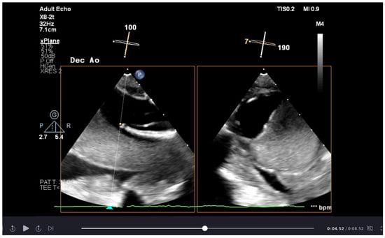 The following supporting information can be downloaded at: https://www.mdpi.com/article/10.3390/jcdd12040130/s1, Video S1: Transoesophageal echocardiogram showing thrombosis of the false lumen post deployment of aortic graft. Video S2: Transoesophageal echocardiogram showing aortic dissection of the descending lumen with blood flow through true lumen. Video S3: Transoesophageal echocardiogram showing blood flow the deployed graft.