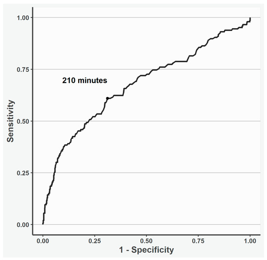 Receiver operating curve of the cut-off cardiopulmonary time point investigated using restricted cubic spline analysis. According to the spline analysis, 210 min was estimated as the cut-off cardiopulmonary time point; a longer time was associated with 30-day mortality.
