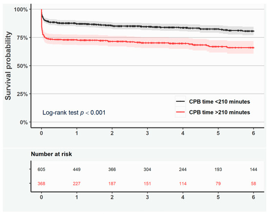 The unadjusted Kaplan–Meier curves showed shorter cumulative survival if CPB time was >210 min (log-rank test p < 0.001, Figure 2).