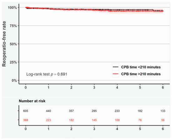 Shorter survival was observed if the duration of surgery exceeded >210 min in patients with ascending aortic surgery only (log-rank test p < 0.001; Figure S5), but not in patients with aortic root surgery only (log-rank test p = 0.306; Figure S6). Reoperation-free survival was similar in patients with CPB time > 210 min as compared with <210 min according to the Kaplan–Meier curves and adjusted RMST ratio (Figure 3 and Table 5).