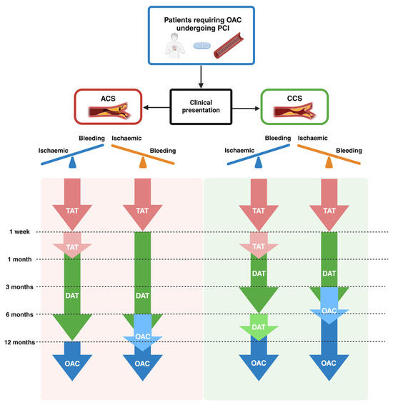 Most recent ESC guidelines for the management of ACS recommend TAT for 1 week in patients with an OAC indication undergoing PCI, followed by DAT for 12 months, and then OAC alone (Class I, Level of Evidence A). However, DAT for longer than 1 week and up to 1 month should be considered in patients with high ischemic risk or with anatomical and procedural features that overcome the bleeding risk (Class IIa, Level of Evidence C). On the other hand, in patients with a predominant bleeding risk, discontinuation of DAT after 6 months and continuation of OAC alone may be considered (Class IIb, Level of Evidence B). Furthermore, prasugrel or ticagrelor as part of TAT is not recommended (Class III, Level of Evidence C) [24].
