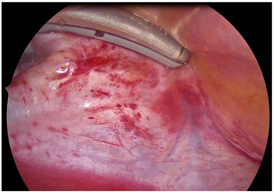 General anesthesia was administered with a double-lumen endobronchial tube for selective lung ventilation. In all patients, unilateral thoracoscopic access with 5 mm ports was used. As previously described [18], antral isolation of both pairs of PVs was performed across four to six applications using a bipolar radiofrequency (RF) clamp, and was introduced using a LumiTip (Atricure, Mason, OH, USA) with the 5 mm port removed (Figure 3). PVI was assessed during the endocardial stage by mapping and pacing through an endovascular catheter (exit block). Left atrial posterior wall isolation (LAPWI) was performed epicardially in all patients with two lines: (i) a roof line (connecting both superior PVs) and (ii) an inferior line (connecting both inferior PVs). Either a bipolar RF pen or a linear pen device (Isolator Pen and Coolrail, Atricure, Mason, OH, USA) was used for LAPWI. The posterior mitral line, connecting the mitral annulus to the left inferior PV, usually performed endocardially, while the ablation of the Ligament of Marshall can be performed epicardially, if deemed appropriate. Left atrial appendage (LAA) clipping was performed in 10 patients (90.9%) with the AtriClip device (AtriCure, Mason, OH, USA).