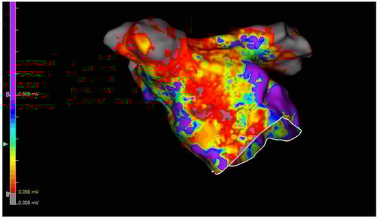 Percutaneous endocardial mapping and ablation was performed via the femoral venous approach. A decapolar catheter (Biotronik, Berlin, Germany, or Abbott, Abbott Park, IL, USA) was placed in the coronary sinus under fluoroscopy, and a single transseptal puncture was performed with a long sheath (SL0, Abbott, USA) and BRK needle under TOE and fluoroscopy guidance. Before the transseptal puncture, full heparinization (1000 U heparin per 10 kg body weight) was given with a targeted activated clotting time of 300 s. An electroanatomic map of the left atrium (LA) was performed either with EnsiteX system (Abbott) using the multipolar grid-mapping catheter (Advisor HD Grid, Abbott, Abbott Park, IL, USA) or with a basket-shaped mapping catheter (IntellaNav Orion, Boston Scientific, Malborough, MA, USA) and Rhythmia system (Boston Scientific, Malborough, MA, USA). PVI and LAPWI were assessed by voltage map (Figure 4) and pacing maneuvers (entrance and exit block). The voltage map was analyzed afterwards to identify possible gaps in PVI and PW. Then, the SL0 sheath was exchanged with the steerable (15F) long sheath (FaraDrive, Boston Scientific, Malborough, MA, USA), and the ablation PFA catheter was introduced into the LA.