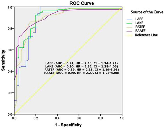 The echocardiographic parameters LAEF, LAKE, RATEF, and RAAEF demonstrated strong discriminatory ability in predicting POAF, with an area under the curve (AUC) exceeding 0.89. The Kaplan–Meier graph in Figure 1 illustrates the individual discriminative abilities of these atrial function parameters. Further predictive assessment using binary logistic regression identified these parameters as significant independent predictors of POAF.