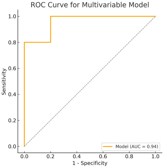 In the multivariable Cox regression model (Figure 2.), LAKE (HR = 0.27, 95% CI 0.16–0.46, p < 0.001), hypertension (HR = 11.87, 95% CI 1.19–118.25, p = 0.035), left ventricular ejection fraction (HR = 1.08, 95% CI 1.01–1.15, p = 0.020), and peripheral vascular disease (HR = 40.28, 95% CI 3.81–425.80, p = 0.002) emerged as independent predictors of POAF. The final model demonstrated a significant discriminatory ability with an AUC of 0.94 (95% CI 0.86–0.94). The combined model demonstrates superior predictive performance compared with individual predictors, confirming the additive value of combining echocardiographic and clinical parameters in POAF risk stratification. These findings highlight the potential of LAEF, LAKE, RATEF, and RAAEF as valuable echocardiographic markers for risk stratification and the early identification of patients at increased risk for POAF. However, after adjusting for clinical factors, LAKE and clinical parameters (hypertension, left ventricular ejection fraction, and peripheral vascular disease) remained independent predictors of POAF.