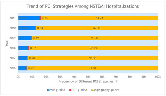 The use of intracoronary imaging (ICI), including intravascular ultrasound (IVUS) and optical coherence tomography (OCT), has gained popularity during percutaneous coronary intervention (PCI) by allowing precise lesion assessment and stent optimization [,,]. While there is evidence supporting the use of ICI in STEMI cases, its role in NSTEMI remains underexplored []. A study from the British Cardiovascular Intervention Society (BCIS) Registry revealed that while ICI use has increased over the last decade, the utilization rate remained low overall and was lowest in acute coronary syndrome [].