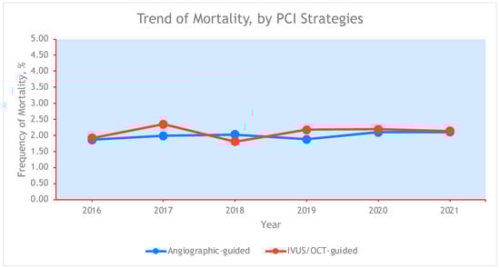 Discharge weights provided by HCUP were applied to derive nationally representative estimates. Categorical variables were summarized as frequencies and percentages, while continuous variables were presented as means with standard deviations. Between-group comparisons were conducted using chi-square tests for categorical variables and linear regression for continuous variables. Statistical significance was defined as a two-tailed p-value < 0.05. Consistent with HCUP data use guidelines, cells with ≤10 observations were not reported. Temporal trends in PCI strategies and in-hospital mortality were visually represented and statistically analyzed using the Cochran–Armitage test. Outcomes for ICI-guided PCI were compared to angiography-guided PCI. Subsequently, predictors of in-hospital mortality among individuals undergoing ICI-guided PCI were analyzed. Multivariable logistic regression models, including covariates with a threshold p-value < 0.20, were utilized to adjust for baseline differences. To reduce confounding, we performed 1:1 propensity score matching (PSM) between ICI- and angiography-guided PCI cohorts. Propensity scores were derived from a logistic regression model incorporating 32 clinically relevant covariates, including demographics, comorbidities (e.g., diabetes, chronic kidney disease), available procedural details (use of fractional flow reserve, chronic total occlusion, type of stents, mechanical circulatory support), and hospital characteristics. Nearest-neighbor matching with a caliper width of 0.01 standard deviations achieved balanced cohorts (standardized mean differences within 0.1 post-matching). Outcomes were then compared using conditional logistic regression adjusted for HCUP sampling strata. All statistical analyses were performed using STATA version 17.0 (StataCorp, College Station, TX, USA).