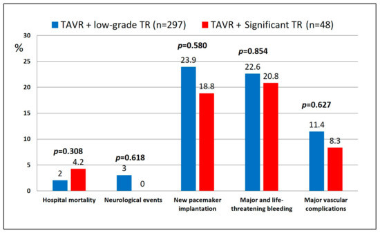 In order to improve the clinical outcome and prevent re-hospitalization, patients undergoing surgical AVR can also be subjected, if needed, to concomitant left or right atrio-ventricular valve repair or replacement during the same surgical session. On the other hand, TAVR is still performed as a stand-alone procedure and patients with a concomitant severe tricuspid regurgitation traditionally cannot undergo, at the same time, a double valve treatment. Moreover, not all centres performing TAVR can offer transcatheter tricuspid procedures, yet. Therefore, patients with a significant TR remain patients at risk of worse clinical outcome and repeated re-hospitalizations even after TAVR when compared to patients with low-grade TR, but this is yet to be confirmed and the topic is still under debate. In order to verify the weight of the untreated significant TR on clinical outcome at short-term follow-up, we analysed and compared data from patients undergoing TAVR with or without concomitant significant TR.