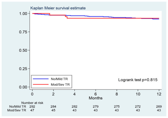 Among all discharged patients (n = 337), 26 died within 1 year (including 7 cases who died within 30 days), corresponding to a mortality of 7.9 deaths per 100-person year (95%CI 5.2–12.0, 22 patients) in the low-grade TR group and 9.1 deaths per 100-person year (95%CI 3.4–24.3, 4 patients) in the significant TR group (logrank test p = 0.815), with an HR (low grade vs. significant TR) of 0.87, 95% CI 0.26–2.89 (Table 3) (Figure 2). Re-hospitalization for heart failure during the follow-up occurred in 16.5% and 19.6% of patients with low-grade and significant TR, respectively (p = 0.713).