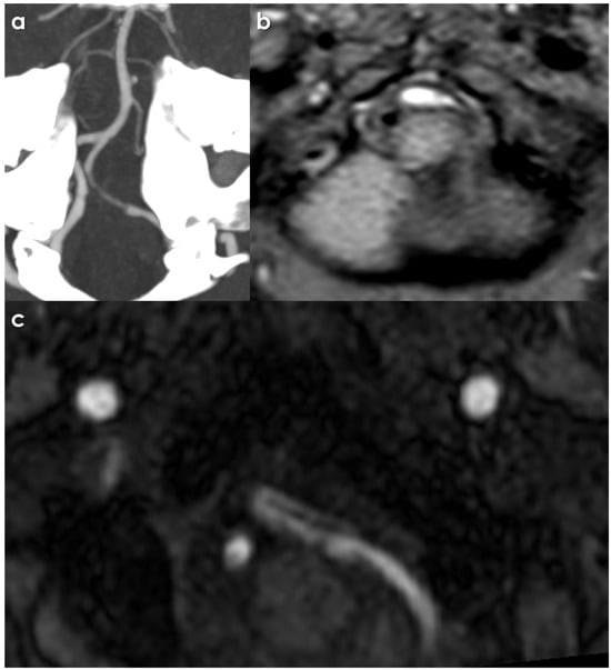 Basi-parallel anatomic scanning MRI (BPAS-MRI) [] is an MRI technique that can reveal the outer contour of the vertebrobasilar artery, even in the presence of occlusion. BPAS is a supplementary imaging modality that plays a supportive role in diagnosing cerebral arterial dissection; it utilizes a heavily T2-weighted imaging (T2WI)** technique that is both easy to perform and effective in providing useful diagnostic insights. This method generates coronal images of the vertebrobasilar artery, using thick slices (20 mm) to visualize the outer shape of the artery. BPAS is particularly effective in detecting fusiform aneurysmal dilations caused by arterial dissection, a feature that may not be identifiable using MRA alone. Although BPAS cannot provide a definitive diagnosis of arterial dissection by itself, it is a valuable screening tool for detecting potential dissection []. Additionally, BPAS helps in differentiating arterial stenosis or occlusion resulting from dissection from the hypoplasia of the vertebral arteries, which is a distinction that is challenging to make with MRA alone []. BPAS-MRI, when combined with time-of-flight (TOF) MRA, CTA, and/or digital subtraction angiography (DSA), enables the visualization of the inner vessel contours, aiding in the differentiation between congenital dysplasia, arteriosclerosis, and dissecting aneurysms within the vertebrobasilar system [,]. The 3.0 T conventional high-resolution MRI can effectively distinguish intracranial arterial walls and lumens from surrounding tissues with a resolution of less than 1 mm (ranging from 0.2 to 0.9 mm). This advanced imaging technique offers vital insights into the structure of the vascular wall and any occluded segments that may not be detected by other methods, such as time-of-flight magnetic resonance angiography (TOF-MRA), CTA, or DSA []. Conventional high-resolution MRI at 3.0 T is routinely used to diagnose conditions such as arterial dysplasia, atherosclerosis, arterial dissection, moyamoya disease, central vasculitis, and reversible vasoconstriction syndrome in the vertebrobasilar arteries [] and has gained widespread acceptance for wall imaging. However, this method requires a 3.0 T MRI, entails prolonged scanning times, and may not be suitable for patients who cannot tolerate the procedure due to significant neurological deficits.