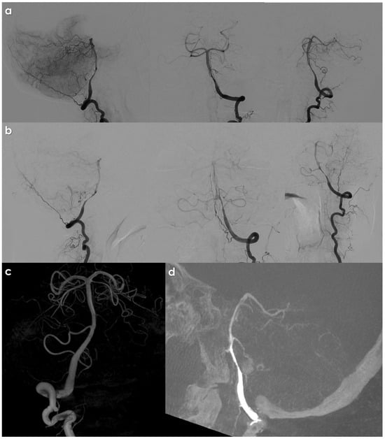 - Lévy, C.; Laissy, J.P.; Raveau, V.; Amarenco, P.; Servois, V.; Bousser, M.G.; Tubiana, J.M. Carotid and vertebral artery dissections: Three-dimensional time-of flight MR angiography and MR imaging versus conventional angiography. Radiology 1994, 190, 97–103. [Google Scholar] [CrossRef]