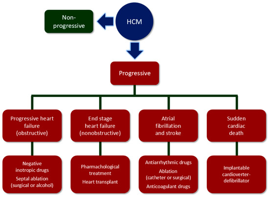 The prognosis of symptomatic HCM patients has significantly improved over the last decades due to the availability of effective preventive and therapeutic measures. Prophylactic use of intravenous implantable cardioverter-defibrillator (ICD), guided by risk stratification algorithms for candidate selection, is highly effective for preventing SCD and has been the main contributor to the observed ≥10-fold decrease in HMC-related mortality to 0.5% per year [2,3,24]. Invasive septal reduction treatments, including surgical septal myectomy and percutaneous alcohol septal ablation, are successful in relieving symptoms and blocking heart failure progression due to severe LVOTO, which is resistant to negative inotropic drugs (i.e., β-blockers, verapamil, disopyramide, and eventually cardiac myosin inhibitors) [25,26,27]. Atrial fibrillation may be anticipated by using a predictive model [28] and recurrent episodes may be reduced by ~50% with antiarrhythmic drugs and catheter or surgical ablation [29]. Moreover, prophylactic anticoagulant treatment is effective in reducing the risk of thromboembolic events [30]. Finally, even end-stage in patients with non-obstructive HCM, which is now responsible for most deaths, can be controlled using drugs, implantable defibrillators, cardiac resynchronization, and heart transplant [31].