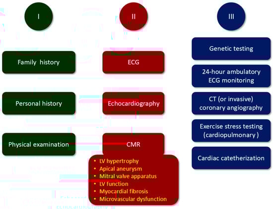 Suspicion of HCM may arise from the presence of a family history of HCM or SDC, typical signs and symptoms, or abnormal results of a routine electrocardiogram (ECG) or echocardiography performed for other indications. According to current guidelines for HCM management [20], initial evaluation should indeed include a comprehensive personal and family history and physical examination, followed by a 12-lead ECG and cardiac imaging (Figure 2).