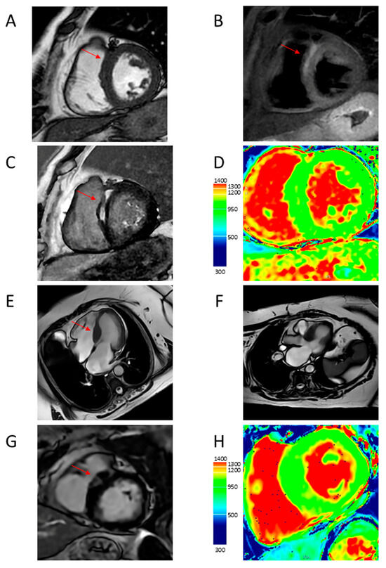 Infiltrative cardiomyopathies include amyloidosis, sarcoidosis, and glycogen/lysosomal storage diseases, such as Fabry–Anderson disease. In amyloidosis, LV hypertrophy is asymmetric in transthyretin amyloidosis and symmetric in immunoglobulin light-chain amyloidosis. Moreover, a right atrial free wall thickness >6 mm is considered to be a specific feature of cardiac amyloid [102]. Diffuse and subendocardial LGE characterizes the early stages, whereas transmural LGE is observed in the advanced stages of the disease [103]. Native T1 mapping and ECV are typically increased and T2 mapping values are also elevated, reflecting myocardial edema [104]. In sarcoidosis, typical findings differ in the acute (inflammatory) and chronic (fibrotic) phases of the disease. In the acute phase, there is LV hypertrophy with signal hyperintensity on T2-weighted imaging and wall motion abnormalities not corresponding to coronary distribution, whereas in the chronic phase, wall thinning or aneurysm are associated with signal hypointensity on T2-weighted imaging and the presence of LGE [105,106]. The distribution of LGE is typically at the level of the septal and lateral wall of basal segments [106], with a pattern predominantly mid-myocardial or subepicardial (non-ischemic) [107]. In Fabry–Anderson disease, LV hypertrophy is diffuse and asymmetrical and is associated with linear or patchy LGE at the basal-inferolateral mid-wall, decreased native T1 mapping values, at variance with other cardiomyopathies, and increased T2 mapping and ECV values [108,109,110].