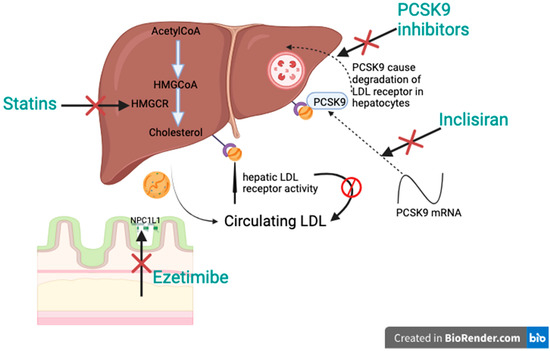 Inclisiran is a synthesized small interfering RNA. It antagonizes PCSK9 mRNA and inhibits PCSK9 synthesis, which is a serine protease that binds to the LDL receptor present on the liver cell surface, which degrades LDL-C, hence the increase in the blood LDL-C concentration (Figure 1) [56,57]. It was approved to be marketed in EU in 2020 and by the FDA and Singapore Health Sciences Authority in 2021. It is administered subcutaneously, as a single dose on day one, then after three months, and then every six months, due to its long half-life [58,59].
