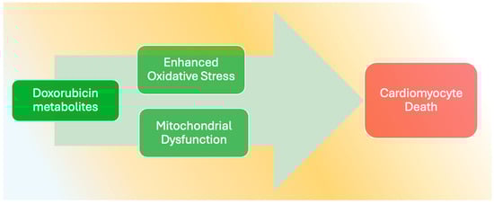 Accumulation of doxorubicin metabolites in the heart enhances oxidative stress via increased production of reactive oxygen species and mitochondrial dysfunction. These mechanisms can ultimately lead to cardiomyocyte injury, cardiac adverse remodeling, and, eventually, heart failure.