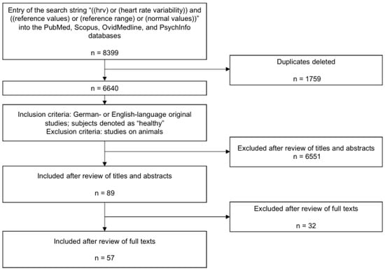This systematic review was conducted under consideration of the PRISMA guidelines [15]; the PRISMA checklist can be found in Supplement S1. The search string “((hrv) or (heart rate variability)) and ((reference values) or (reference range) or (normal values))” was applied to the PubMed, Scopus, Ovid Medline, and PsychInfo databases on 2 November 2022. The hits were then transferred to the Citavi 6 writing software (version 6.12, Lumivero/QSR International).