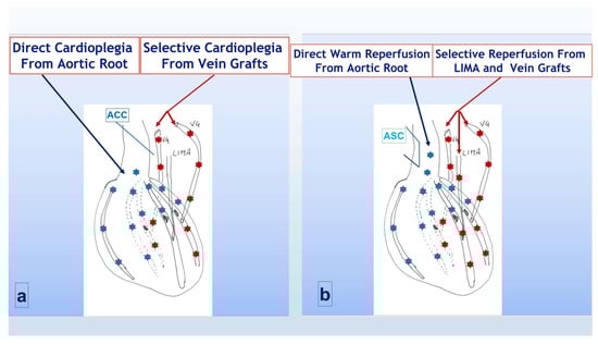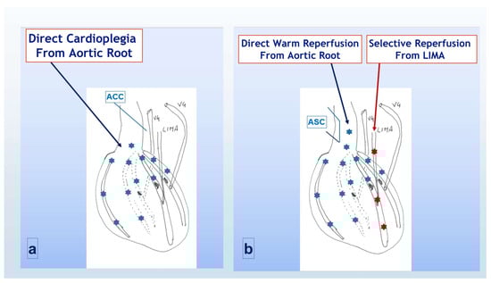 Cardioplegia and reperfusion strategy in group B (SAWR). (a) During aortic cross-clamp period; (b) following cross-clamp removal and side-clamp positioning. ACC = aortic cross clamp; LIMA = left internal mammary artery; VG = saphenous vein graft; ASC = aortic side clamp. Light blue asterisks indicated the flow through the native aortic root and coronaries, red asterisks indicated the flow through the CABG counduits.