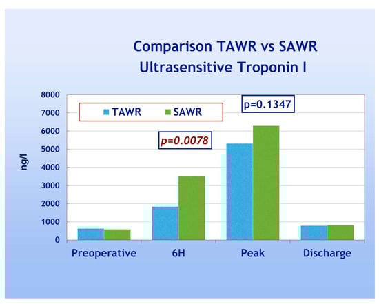 Postoperative TN1 trend TAWR vs. SAWR. TAWR: total antegrade cardioplegia and warm reperfusion; SAWR = standard antegrade cardioplegia and warm reperfusion; 6H: six hours following intensive care admission.