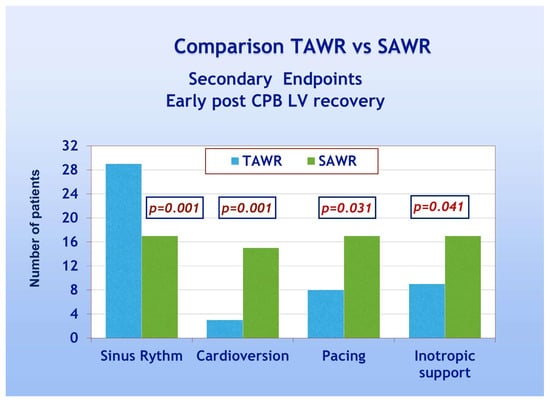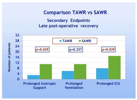 With regard to secondary endpoints, Figure 4 shows a TAWR and SAWR comparison of parameters of early LV function recovery following CPB. Patients of group A showed significantly higher spontaneous recovery of sinus rhythm (90% and 53% for group A and B, respectively, p = 0.001). Patients of group A also showed significantly less frequent need for electrical cardioversion and pacing, thus confirming an overall faster recovery of spontaneous and regular electrical cardiac activity. Patients of group A, furthermore, showed significantly less frequent need for inotropic support compared to group B (28% and 53% for group A and B, respectively, p = 0.041). As far as the comparison between the two groups in terms of late postoperative recovery, as shown in Figure 5, according to previously defined criteria, patients of group A required significantly less frequently prolonged inotropic support and prolonged total ICU stay when compared to group B (p = 0.039). On the other hand, no significant difference was shown in the frequency of prolonged mechanical ventilation. As shown in Table 3, significant recovery of LVEF, compared to the preoperative condition, was shown in both groups either as early recovery (intraoperative trans-esophageal echo with inotropic support) or at discharge (pre-discharge trans-thoracic echo without inotropic support). No significant differences were shown between early and late recovery. The comparison between the two groups, however, never did reach statistical significance. Finally, multivariate analysis did not reach enough statistical power due to the low number of events.