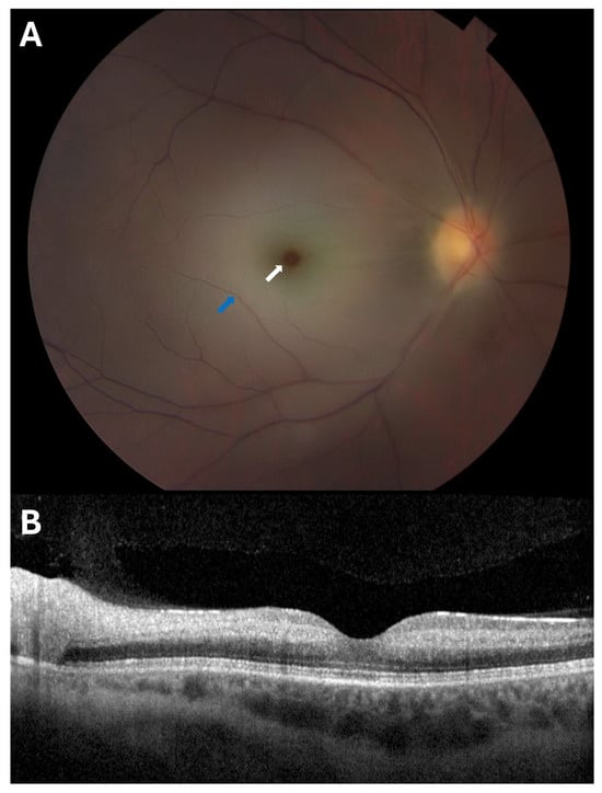 Representative (A) color fundus photography (CFP) and (B) optical coherence tomography (OCT) B-scan images of an eye with central retinal artery occlusion (CRAO). The “cherry red spot” (white arrow) visible at the center of the CFP image is characteristic of CRAO, as the loss of blood flow brought on by the occlusion causes retinal whitening (blue arrow), while the fovea retains its normal red hue. The OCT image demonstrates the characteristic hyperreflectivity and thickening of the inner retina due to ischemia caused by a CRAO.