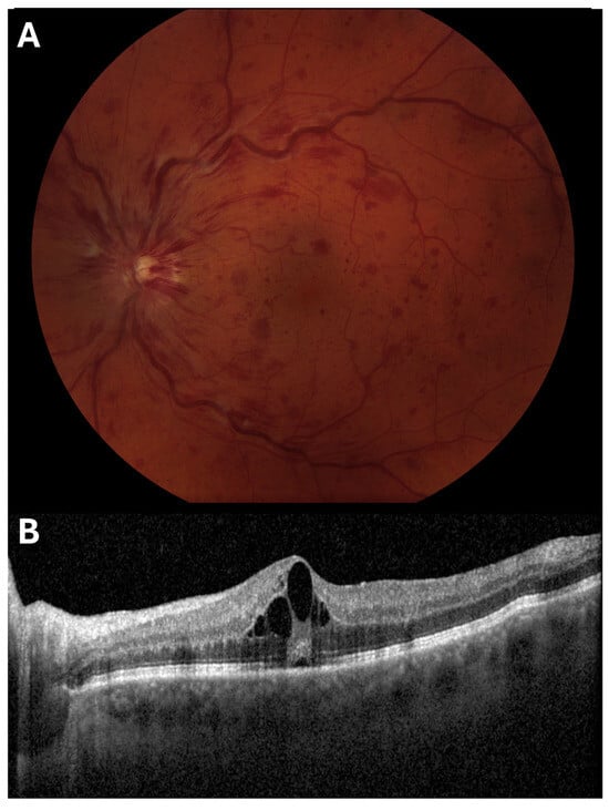 Representative (A) color fundus photography (CFP) and (B) optical coherence tomography (OCT) B-scan images of an eye with central retinal vein occlusion (CRVO).