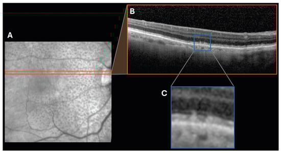 Subretinal drusenoid deposits (SDDs), also called reticular pseudodrusen (RPD), identified on an (A) optical coherence tomography (OCT) en face image with (B) a corresponding B-scan at this location. (C) A zoomed-in segment of the B-scan highlights the SDDs.