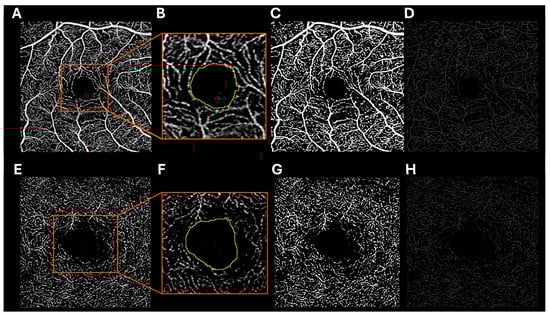 Swept-source optical coherence tomography angiography (SS-OCTA) representative images of the (A) superficial capillary plexus (SCP) and (E) deep capillary plexus (DCP) with additional images demonstrating (B,F) measurement of the foveal avascular zone (FAZ; yellow outline), (C,G) binarization of the vessels for calculation of vessel area density (VAD), and (D,H) skeletonization of the vessels for calculation of vessel length density (VLD).