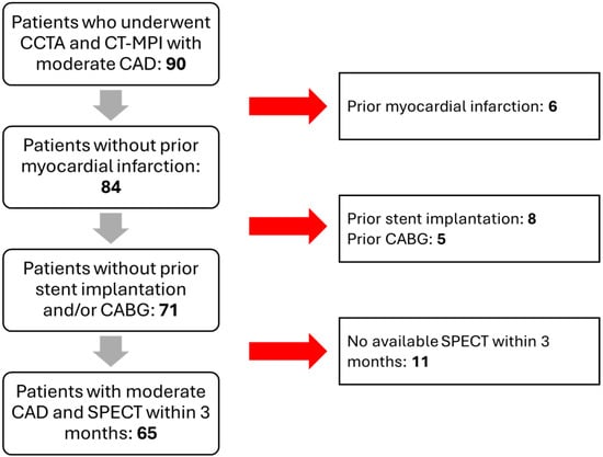 The initial study population consisted of 95 patients. However, 6 patients were excluded due to a previous history of myocardial infarction, 8 patients due to prior coronary stent implantation, 5 patients due to previous coronary artery bypass graft surgery, and 11 patients due to the absence of a stress SPECT myocardial perfusion imaging within three months of the CT examination. Therefore, 65 patients were ultimately included in the study (Figure 1).