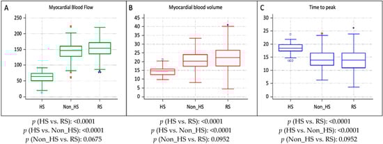 Graphical parameter’s comparison between CAD segments and reference segments. Graphical representation of myocardial blood flow (A), myocardial blood volume (B), and peak time (C) in hypoperfused CAD segment (HS), non-hypoperfused segment (Non_HS), and reference segment (RS).