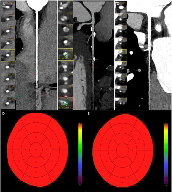 Male patient, 46 years old, with atypical chest pain and ECG abnormalities. Coronary CT angiography examination shows a regularly perfused right coronary artery without significant stenosis (A). The left anterior descending artery exhibits multiple mild stenoses (below 40%) at the mid-proximal segment, while a single moderate stenosis (50–69%) is present at the distal segment (B). The circumflex artery is regularly perfused without significant stenosis (C). (D,E) Myocardial blood flow (MBF) and myocardial blood volume (MBV) after dynamic stress CT examination, without any reductions in blood flow and volume.